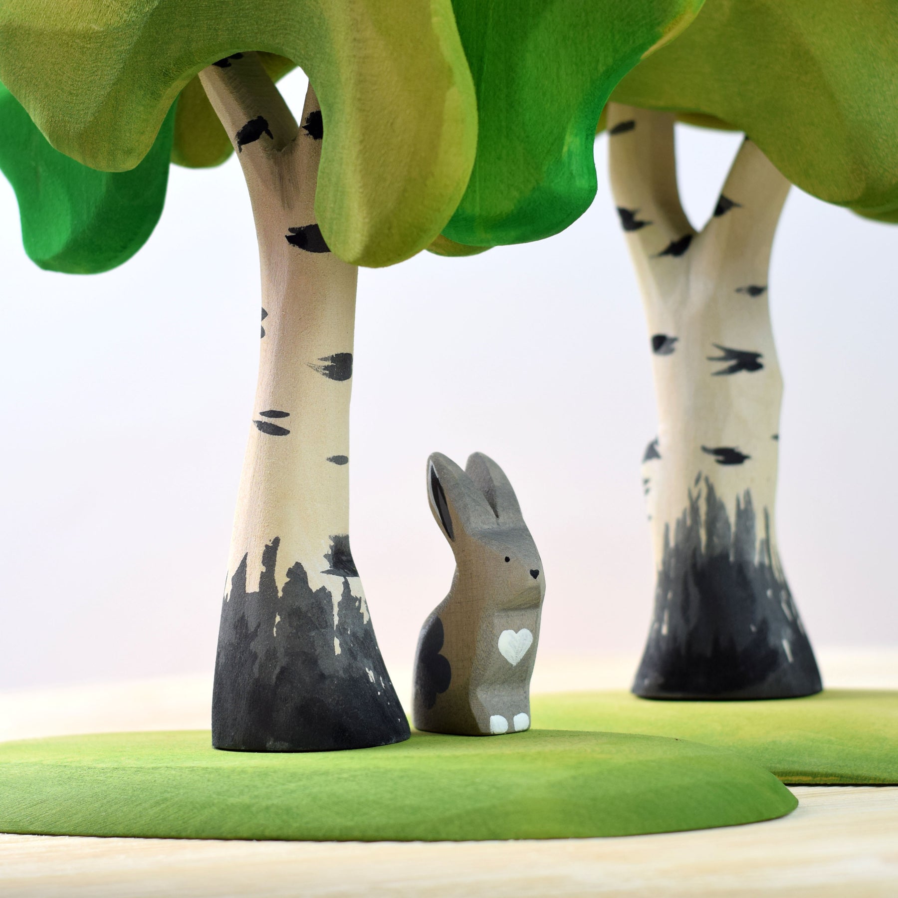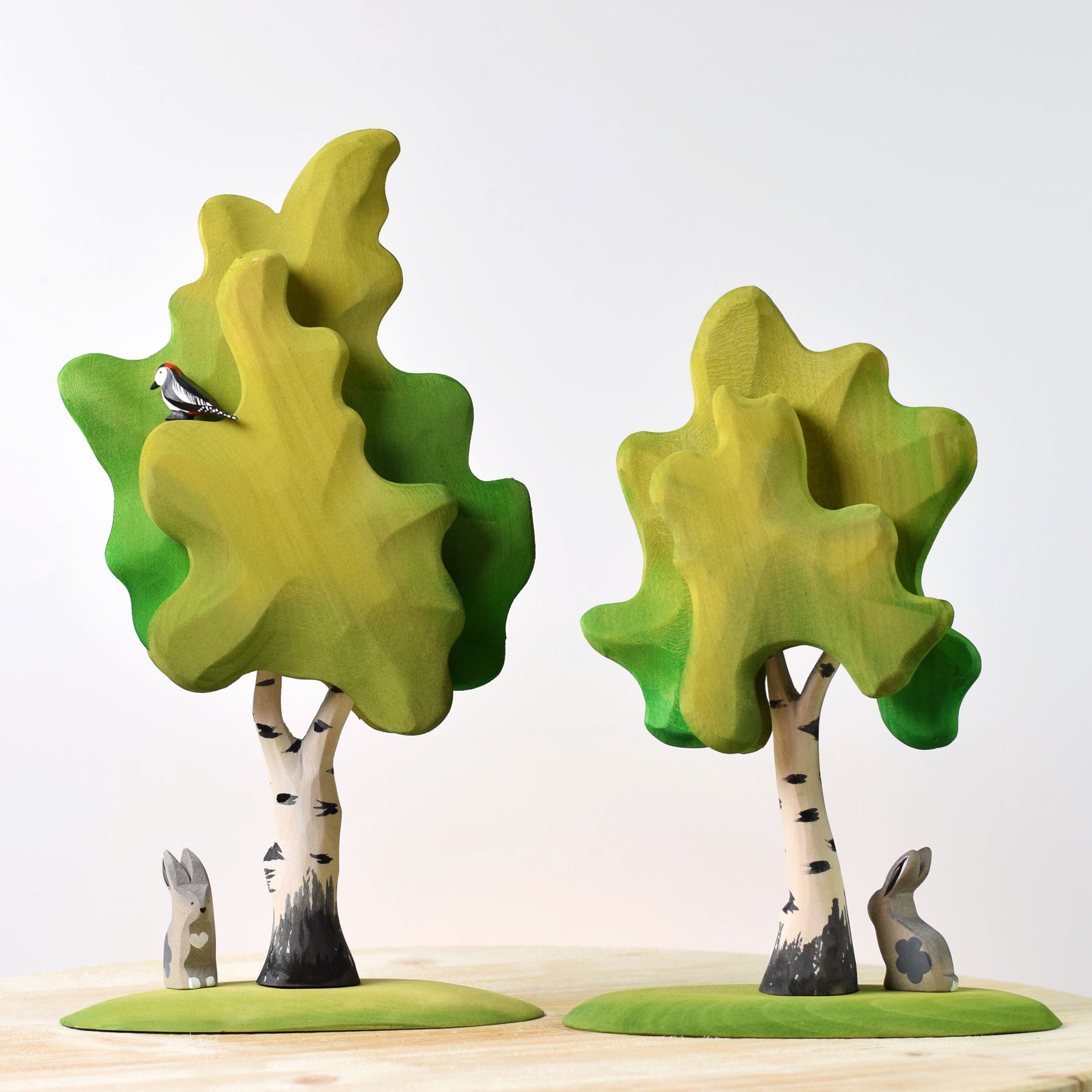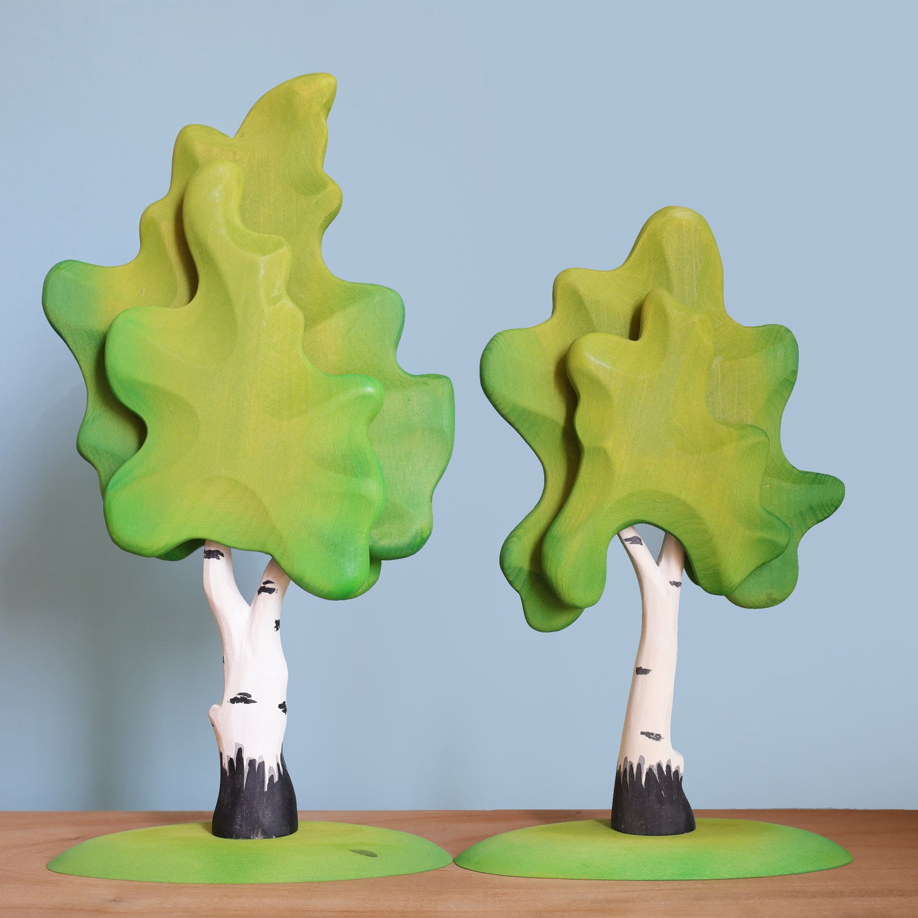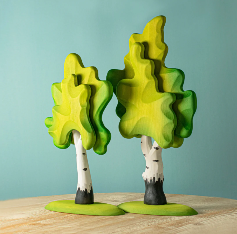 The birch is known as the prince of the forest. That's how we tried to present it at Bumbu Toys. You can find our birches naked but also in color, slightly different in shape. That makes them great for storytelling. I noticed from the way our children play, a diverse tree set that maintains the laws of nature, enriches the imagination of children and prolongs their play. We hope you will love them as well, as our children loved them.