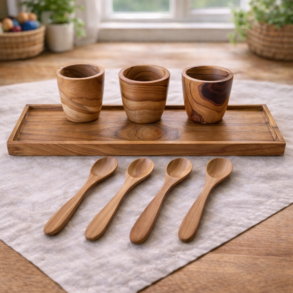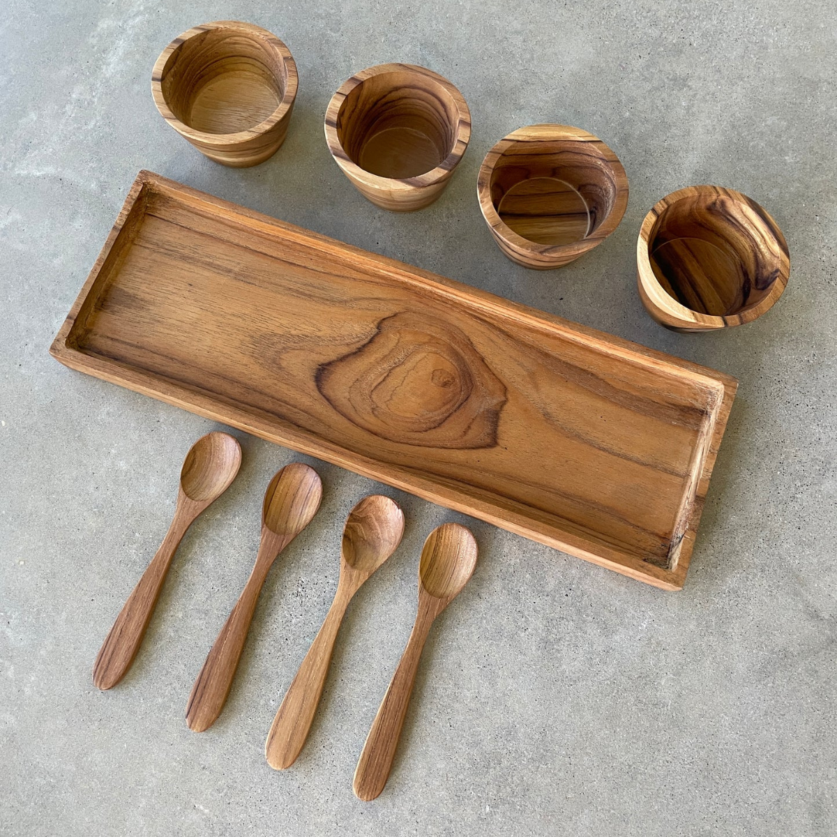 With four solid teak wooden bowls, four perfectly sized mixing spoons, and a smooth rectangular tray to keep everything neatly together, this set invites little hands to experiment, combine, stir, and create. Perfect for potion kitchens, mud play, loose parts exploration, or home corner role-play.