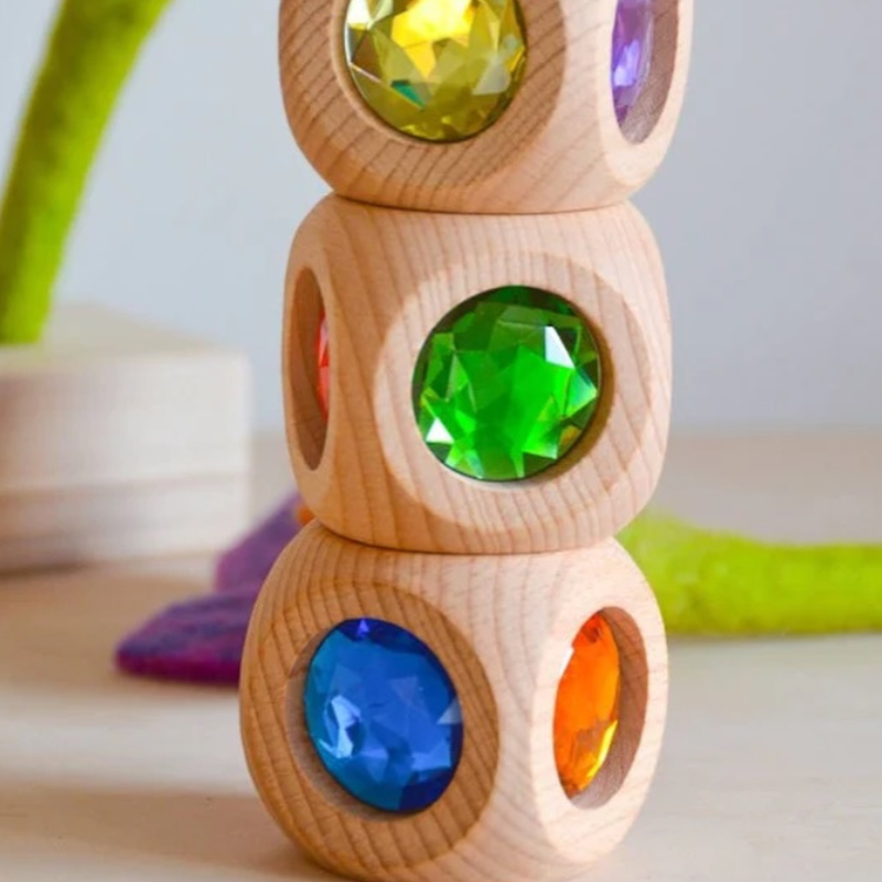 - Single solid wooden cube set with six colorful acrylic gemstones