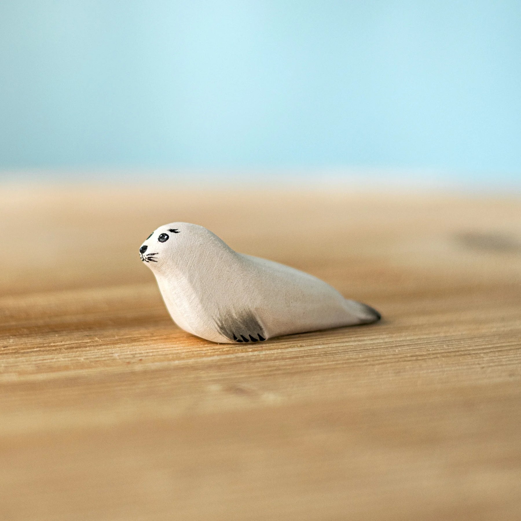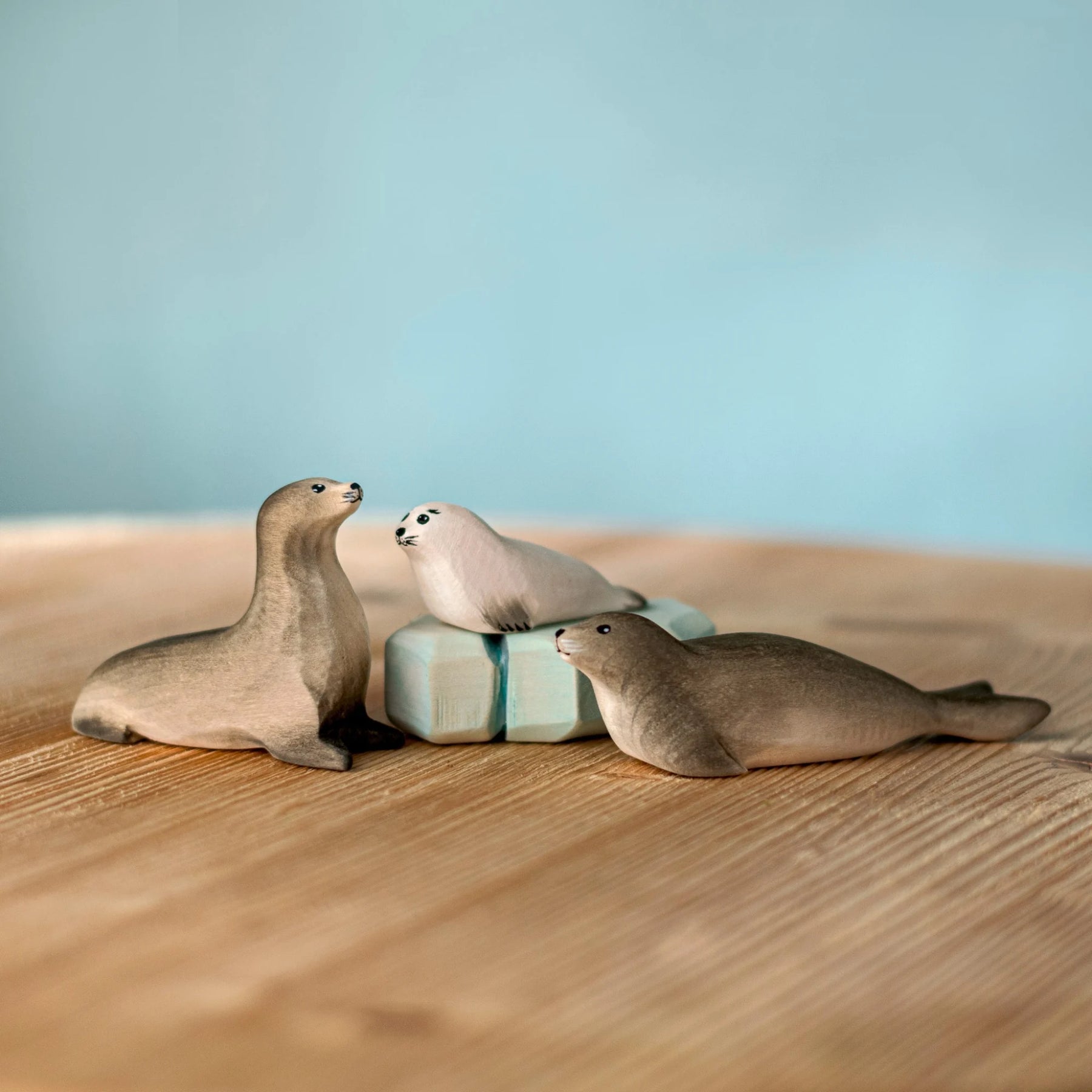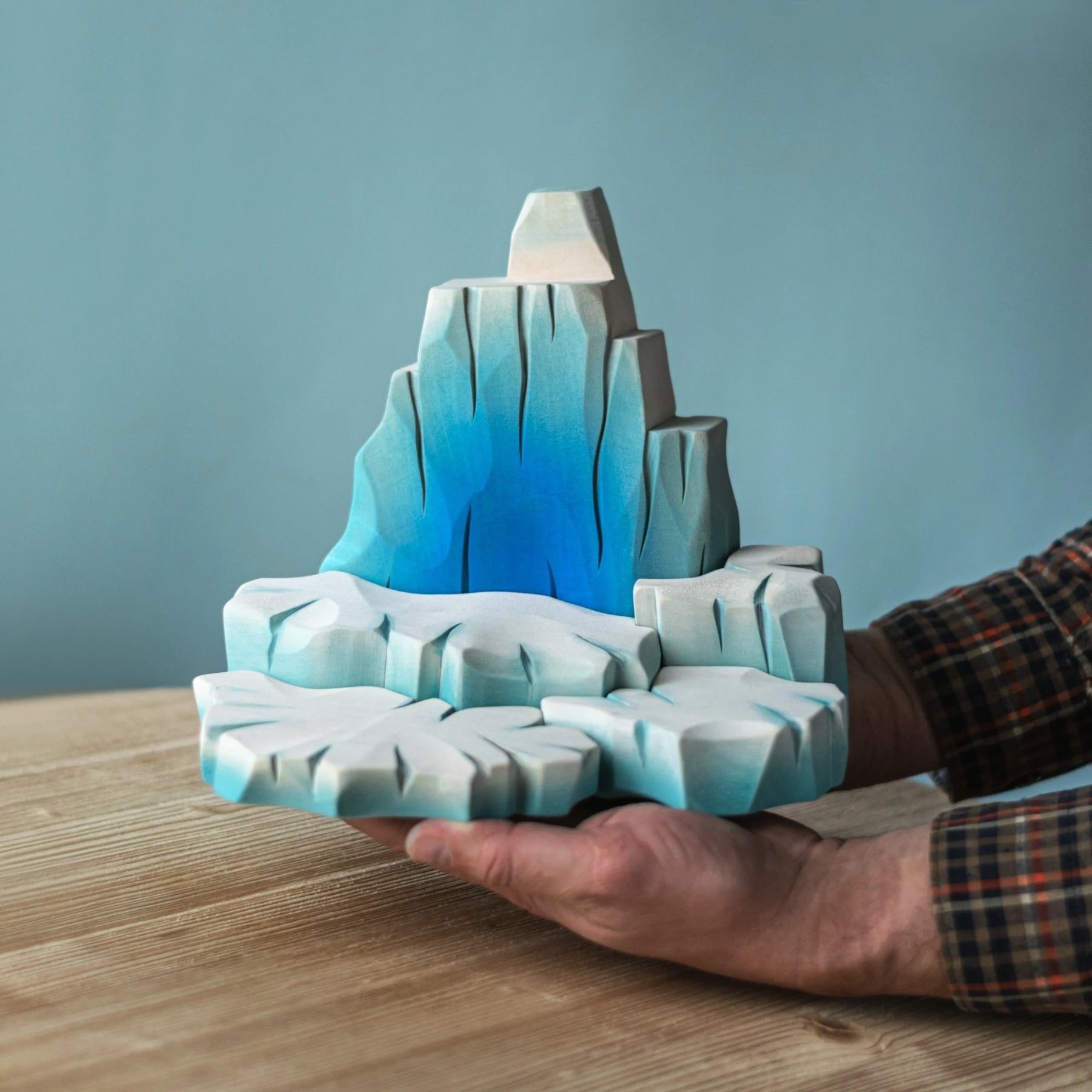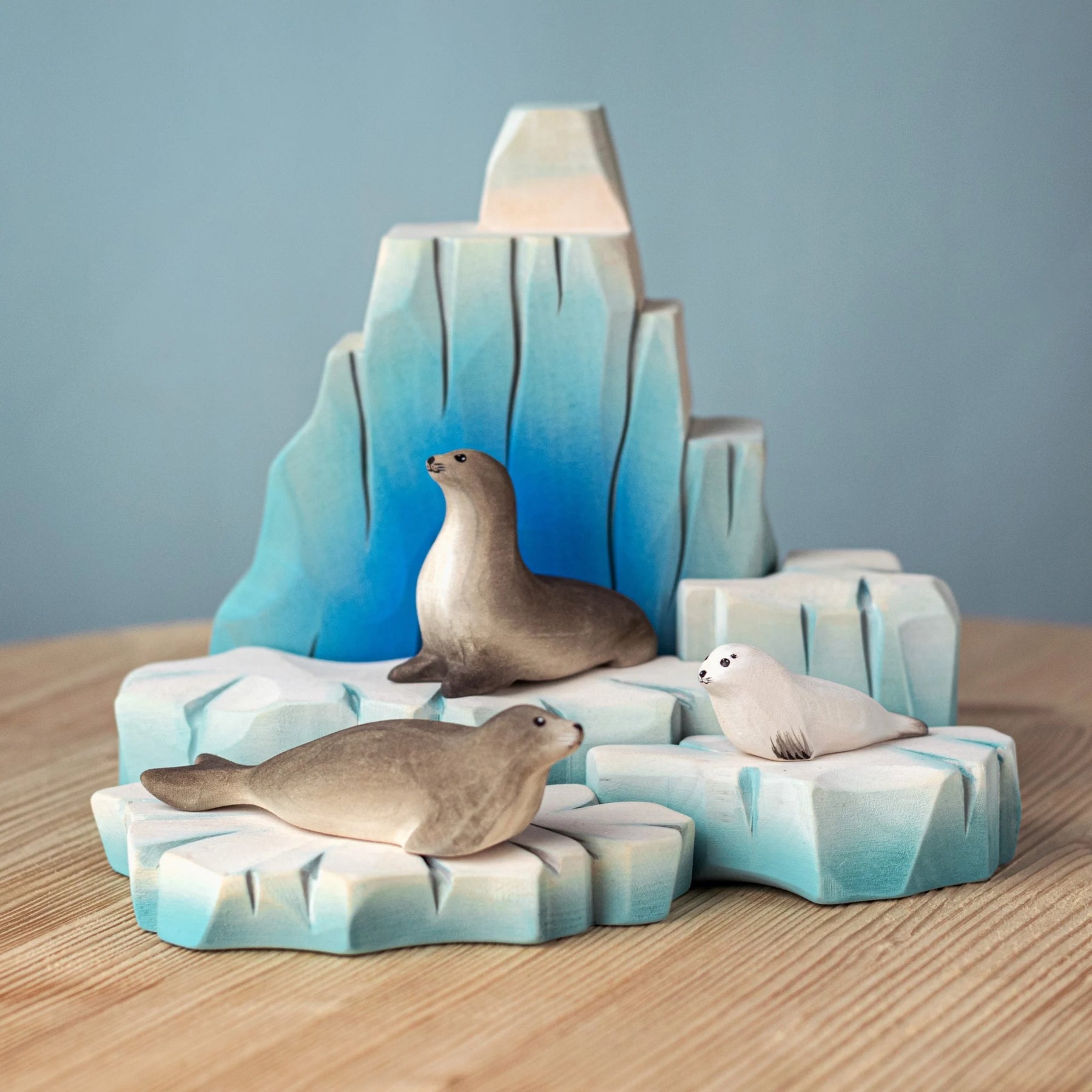 The centerpiece of this set is the impressive Iceberg (19cm x 21cm x 25cm). Hand-carved from solid lime wood, it features deep, jagged cuts that mimic real glacial formations. It is painted with a gradient of non-toxic blue washes, capturing the way light hits ancient ice. The accompanying seals are smoothed to a soft finish, offering a tactile contrast to the rugged mountain.