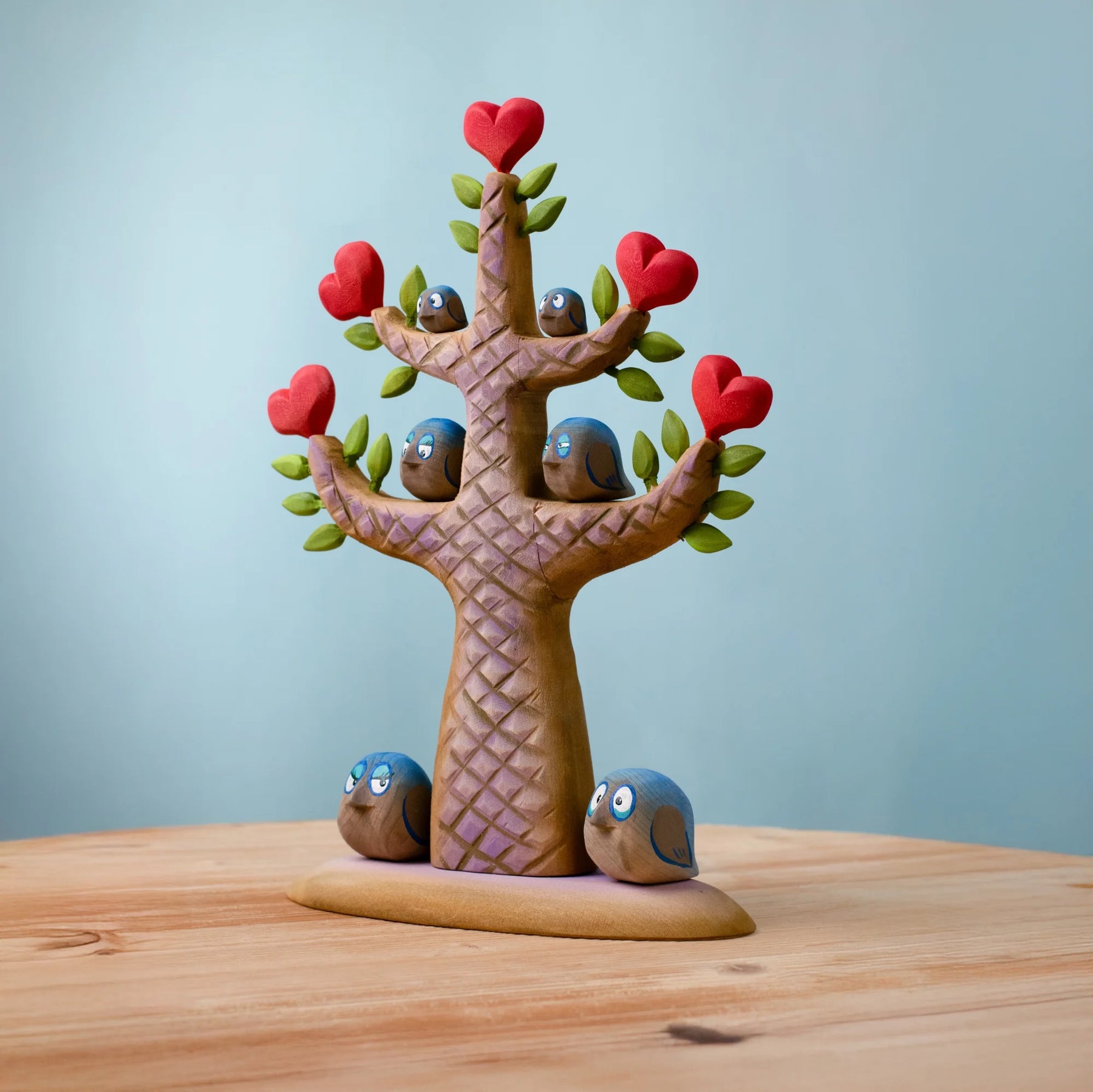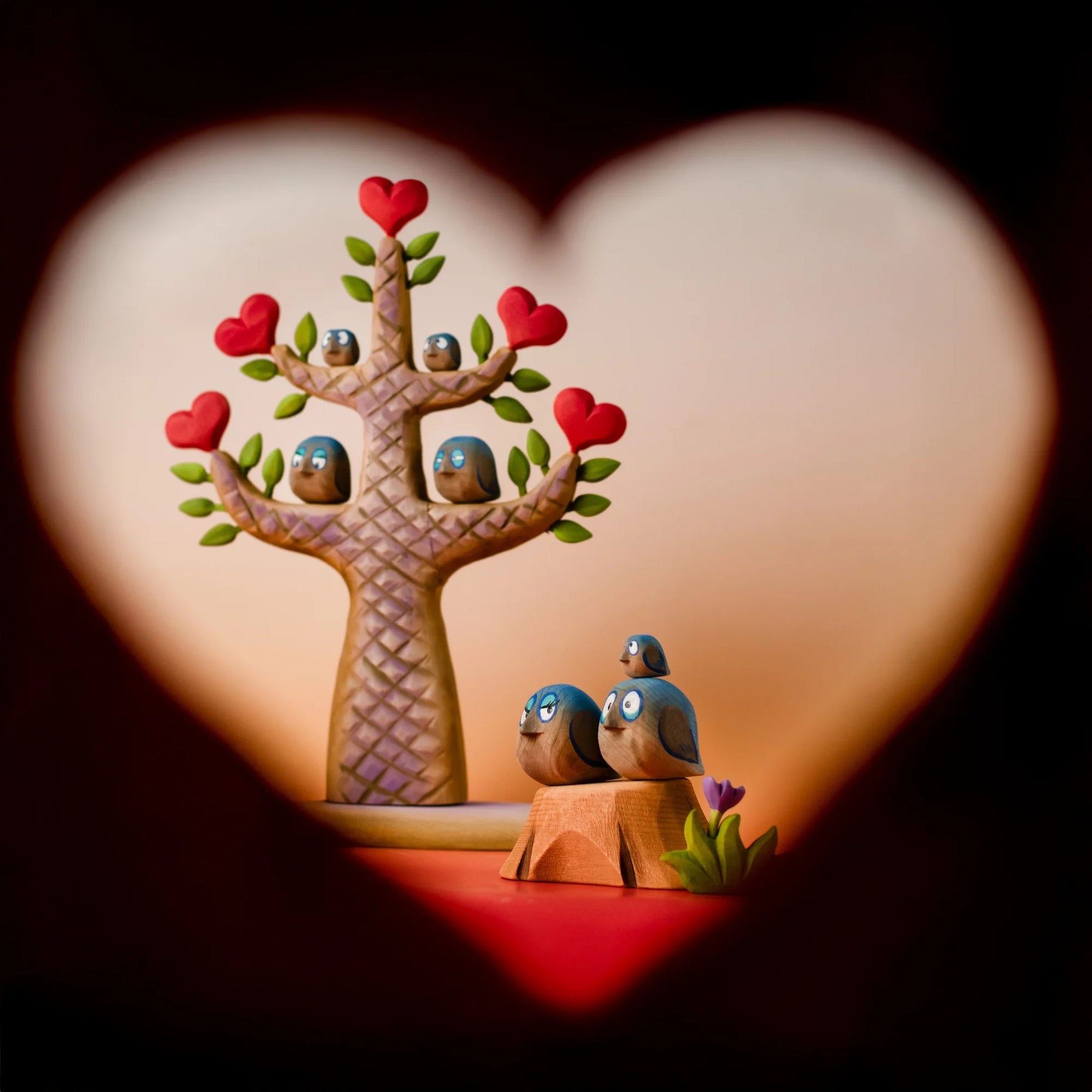 Deep in the Bumbu forest grows a very special tree—the Heartwood. Its branches don't just grow leaves; they bloom with bright red hearts, offering shelter to the "Love Chirps," a family of bluebirds who sing songs of friendship. This set isn't just a toy; it is a miniature universe of affection, waiting for your child to tell stories of how the birds nest, how they chat, and how they care for one another.