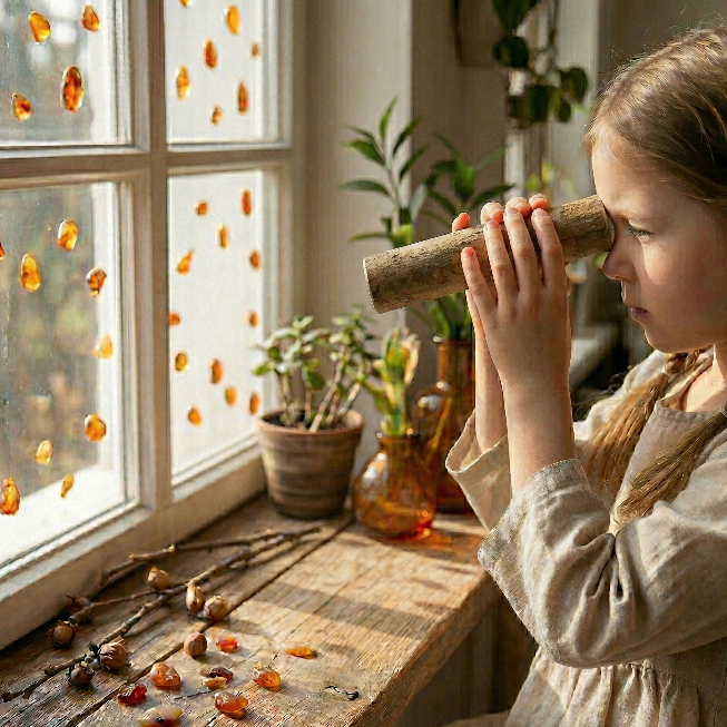 Handmade eco-friendly kaleidoscope made using a branch of a hazel tree and tiny amber pieces. The kaleidoscope contains plastic mirrors, making it light and safe to use for children.