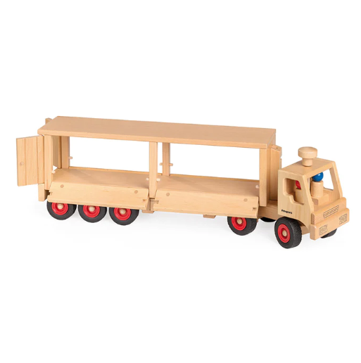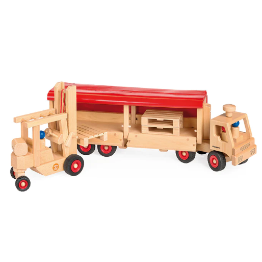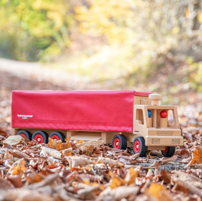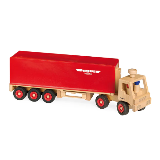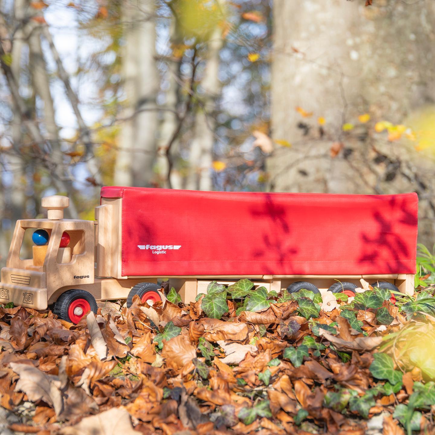 The latest model from the Fagus series of vehicles is characterized by innovative play possibilities, and as a result, it offers a particularly high play value. The tarpaulin can be folded up on both sides or completely removed by means of Velcro. For loading and unloading the lateral raves are folded down and the front part of the truck is decoupled. The semi-trailer is stabilized by means of an extendable support and therefore cannot tip over during loading and unloading.  Loading and unloading takes place through both the side and the rear tailgate.  After loading, the tarpaulin is tacked back to the tail lifts using invisible magnets.