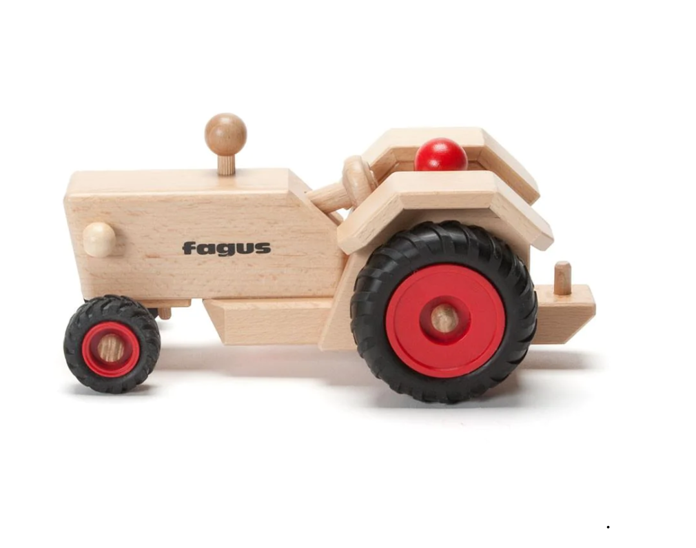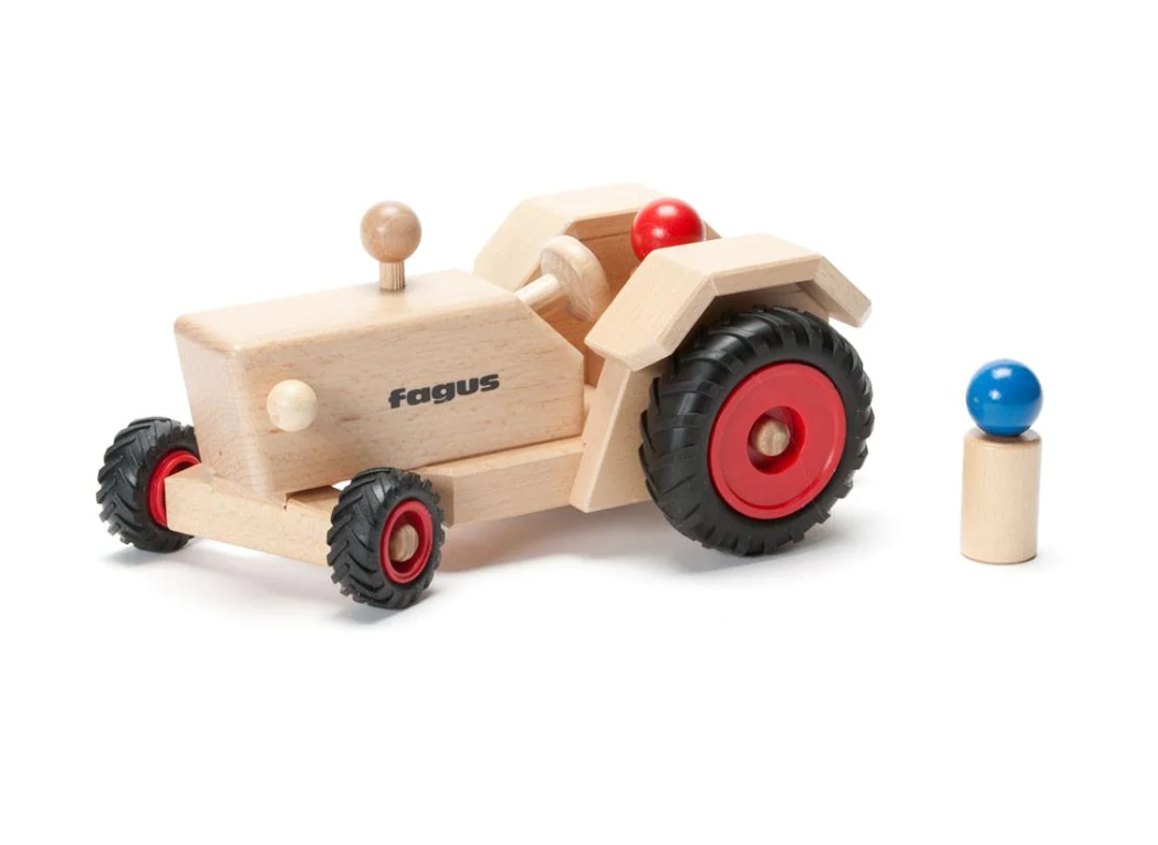 A steerable tractor in a classic style! Comes with two peg dolls who sit in the tractor seat and are removeable. Add a farm cart or hay wagon (sold separately) to do chores around the farm. The wonderful wooden cars and trucks by Fagus are made of beech wood (the Latin word fagus=beech) in a workshop that trains and hires the disabled to produce these durable, heirloom wooden toys. Fagus wooden toys are made without nails, screws or staples, and are interlocked, doweled and glued together. German engineering and craftsmanship ensure this heirloom toy will last for many generations.