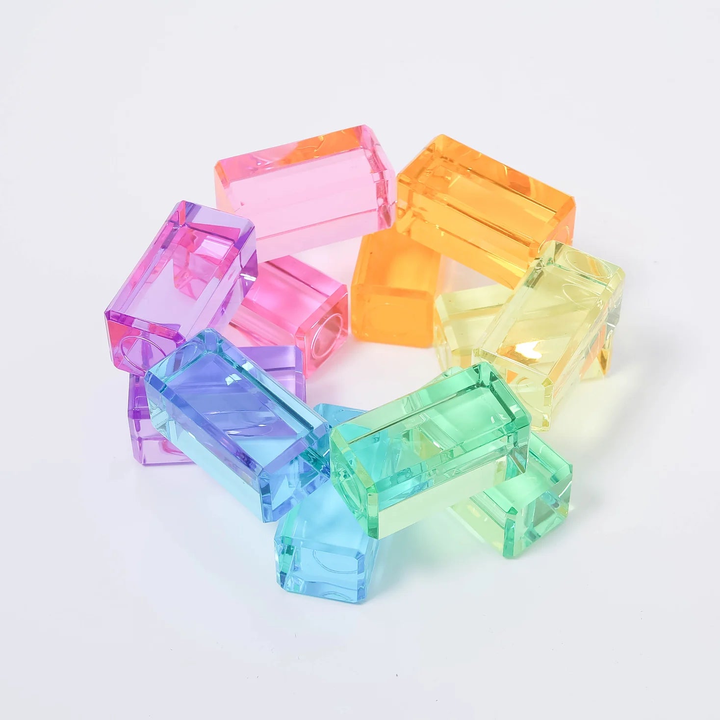 Whether used on their own, paired with a light table, or integrated into larger Bauspiel builds, these pastel blocks add a calming touch of magic to every play session.