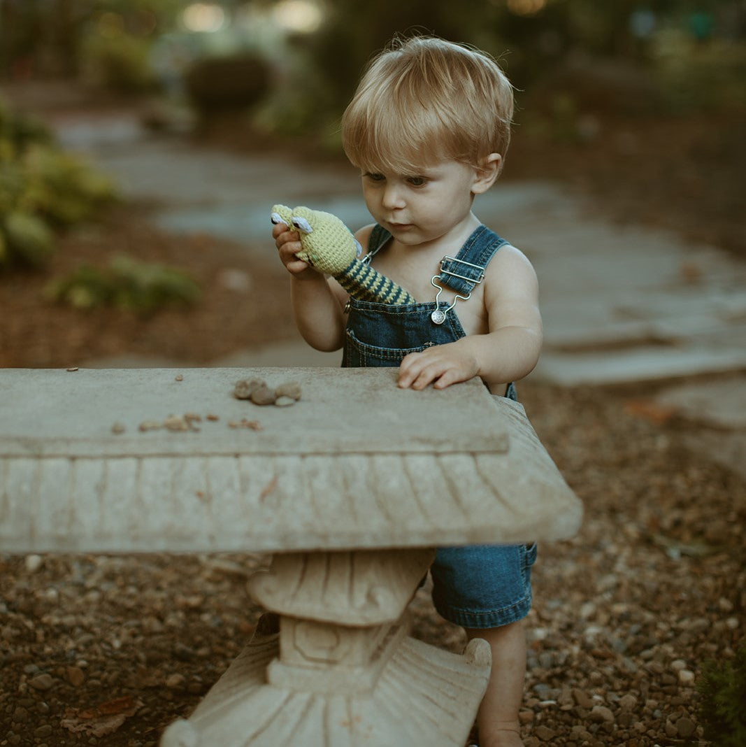 This sweet and gentle frog ring is just the thing for baby's first toy. Lovingly handmade with soft organic cotton yarn, it makes a gentle jingle with each shake. This rattle is perfect for little hands to hold and safe for little teethers.