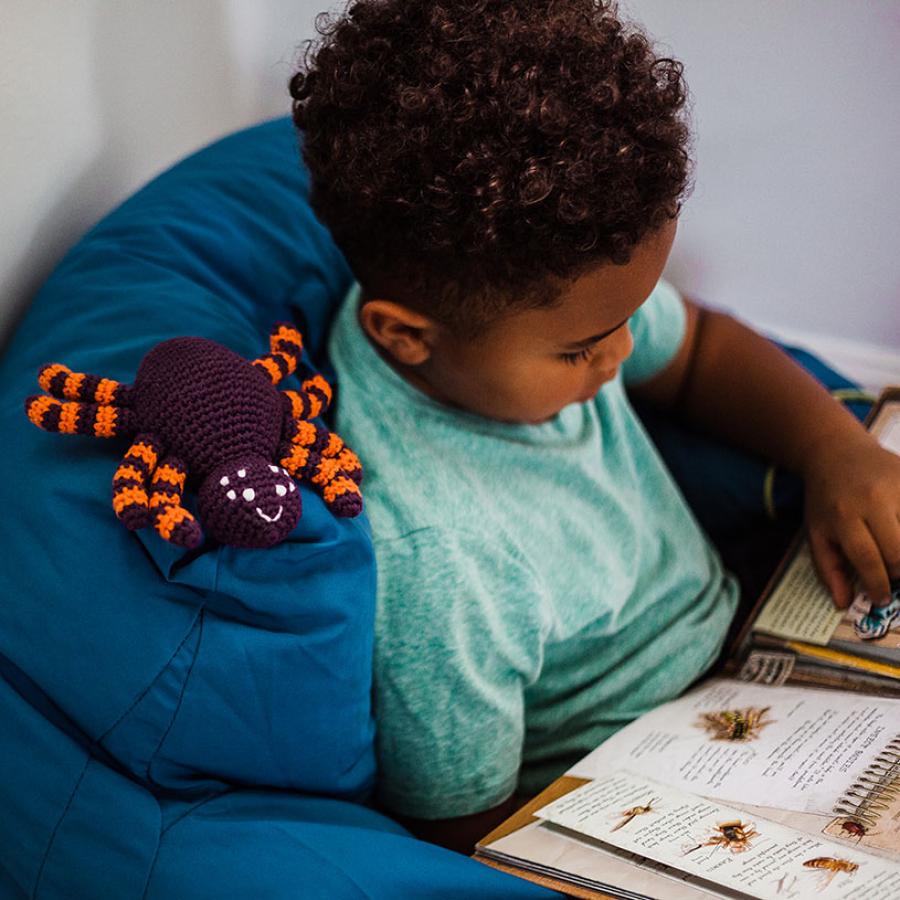 This adorable plush spider is ready to drop in for a play date. Its dangly legs are just right for little hands to grab a hold of. Handmade with soft cotton yarn, the rattle inside this baby toy gives a small jingle when shaken.