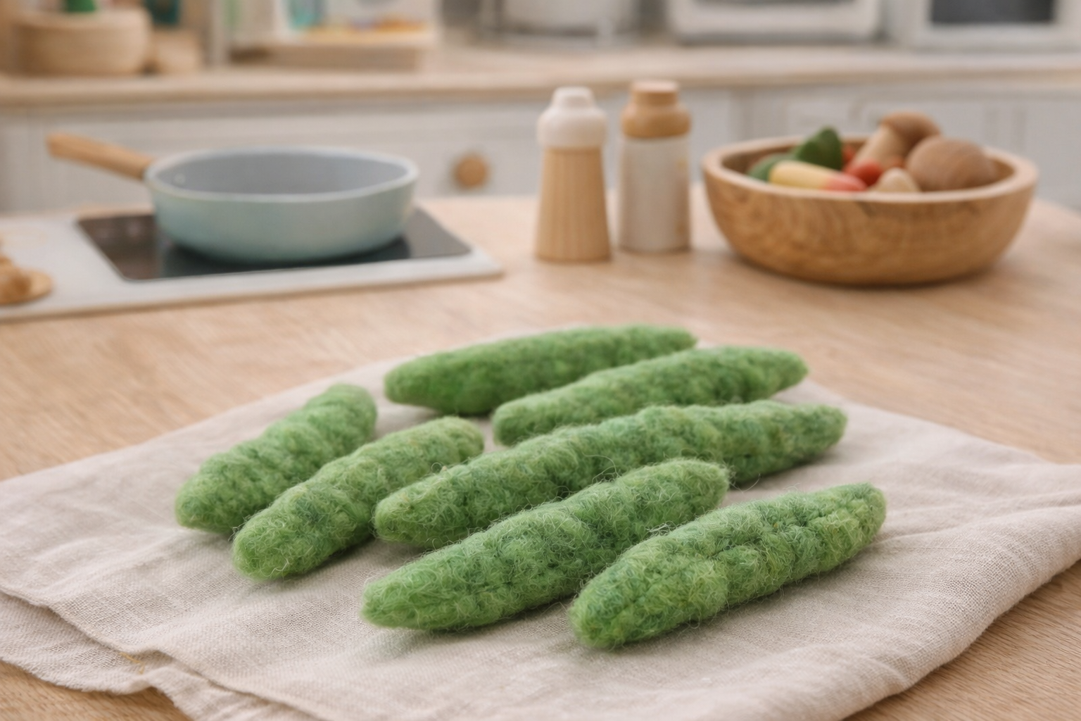Yummy and healthy, our Felt Snow Peas are a fresh new addition to our fabulous food range. Perfect for play kitchens, market stalls, and garden-to-table storytelling, these vibrant green pods bring realistic detail and texture to imaginative food play.