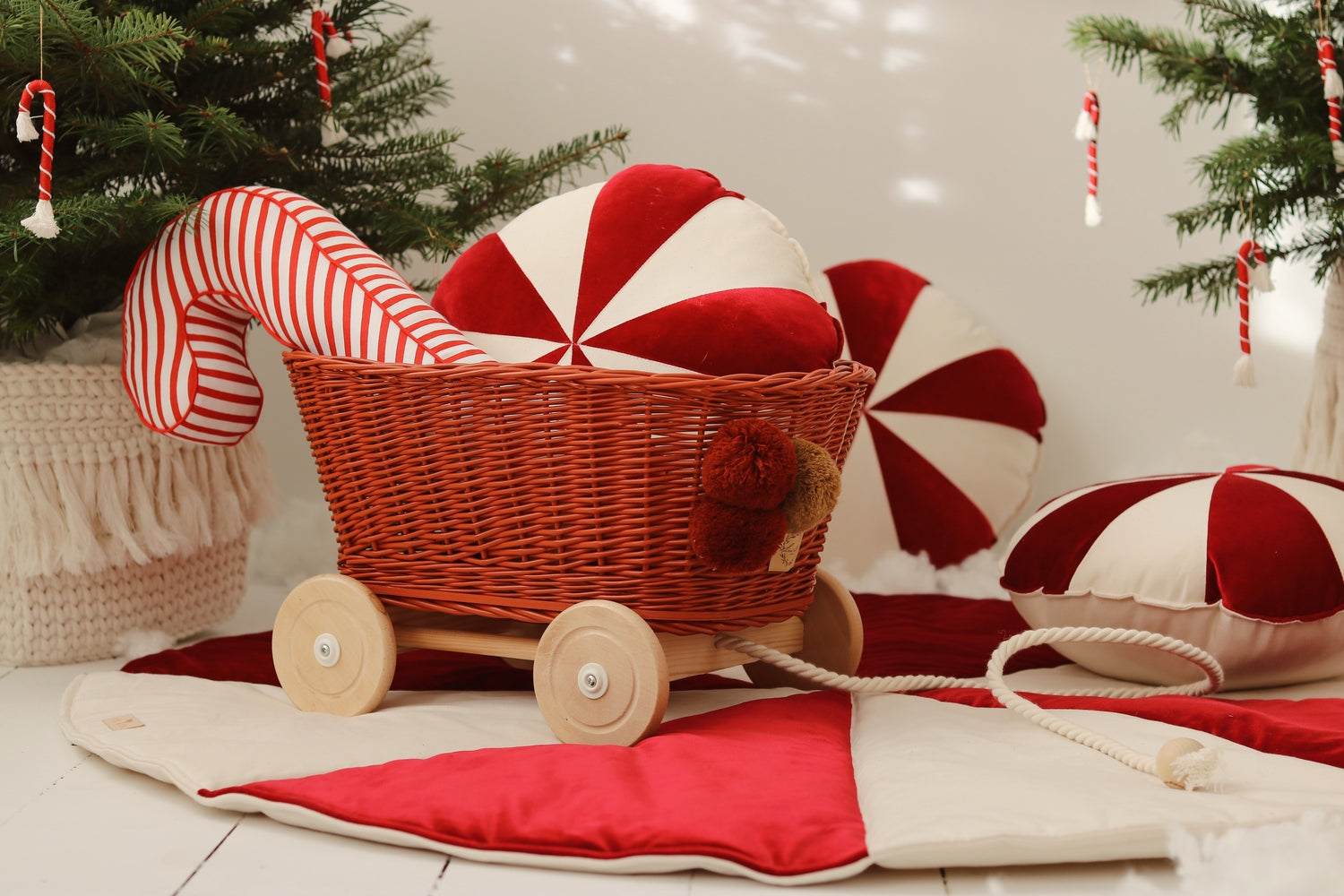 This circus-inspired round mat made of linen and cotton is sewn firmly from candy red-colored linen and thick natural cotton.