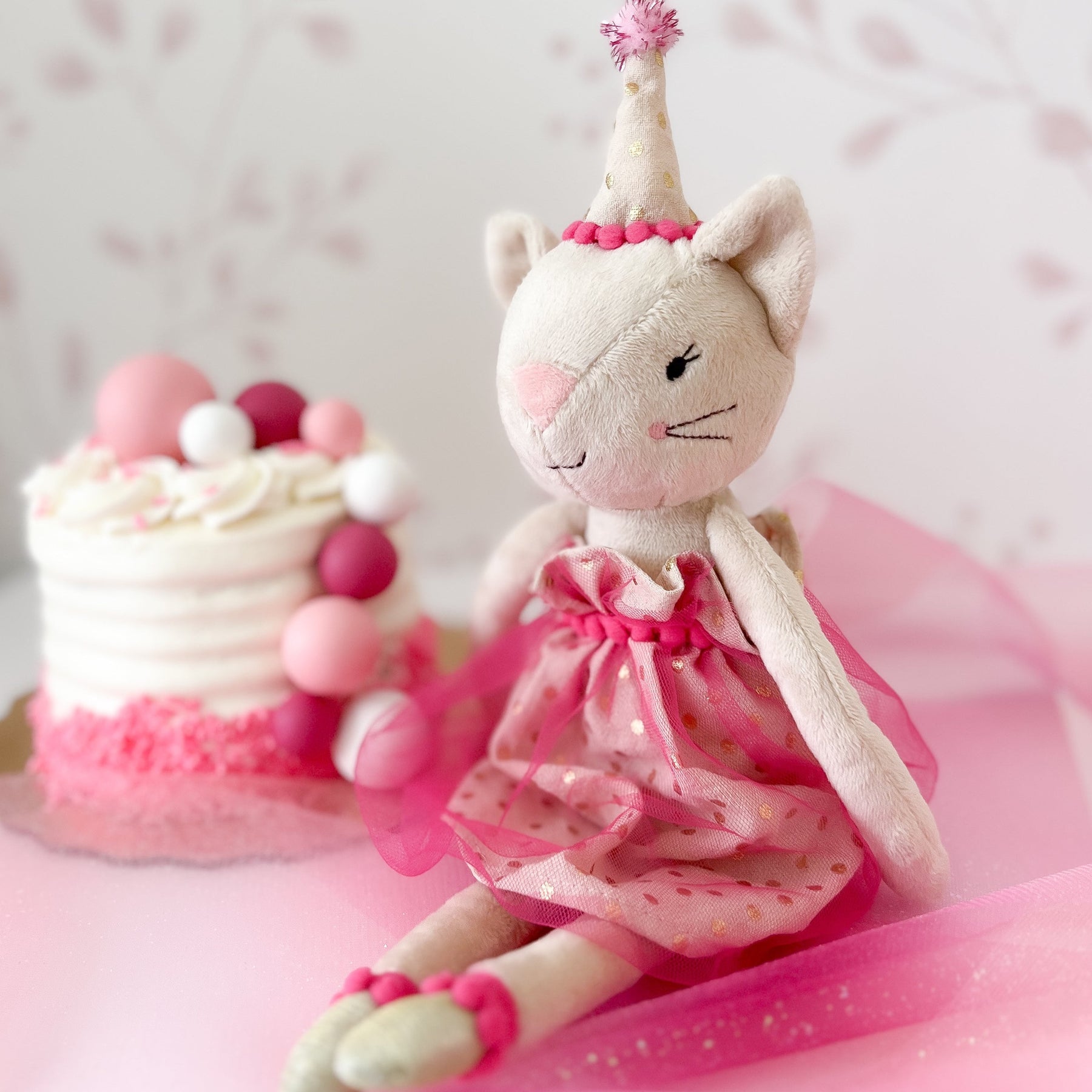 Meet Pia Party Kitty! the life of every celebration! Dressed in her sparkly pink party dress and adorable matching party hat, she's always ready for a fun time. With her sweet whiskers and soft body, Pia is the perfect companion for little ones who love to dance, twirl, and play. Whether it is a tea party, birthday bash, or just everyday fun, this charming kitty is here to bring smiles and giggles wherever she goes. With Pia Party Kitty by your side, every day is a purrfect occasion!