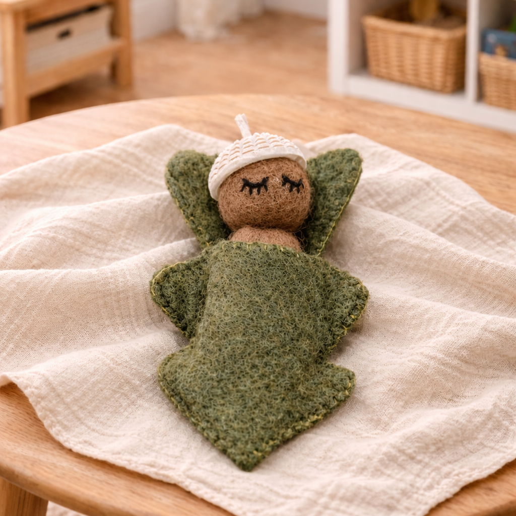 This charming set includes a removable Acorn Baby nestled on a soft felt oak leaf — perfect for imaginative storytelling, nature tables, or gentle play. The acorn baby is handcrafted from wool felt and wood and sits sweetly on its beautifully stitched leaf base.