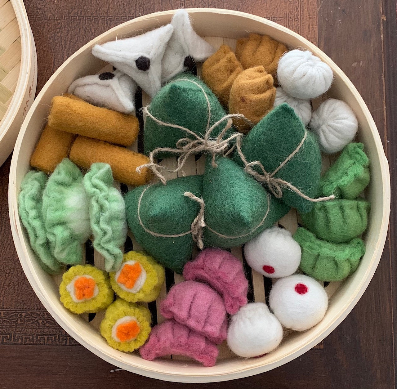 Presented in a real 30 cm diameter bamboo steamer, this piece is both practical and stunning. The steamer is fully functional — simply remove the felt food and it can be used for actual steaming. However, it looks absolutely delightful filled with handmade felt yum cha, ready for pretend restaurant play and family feasts.