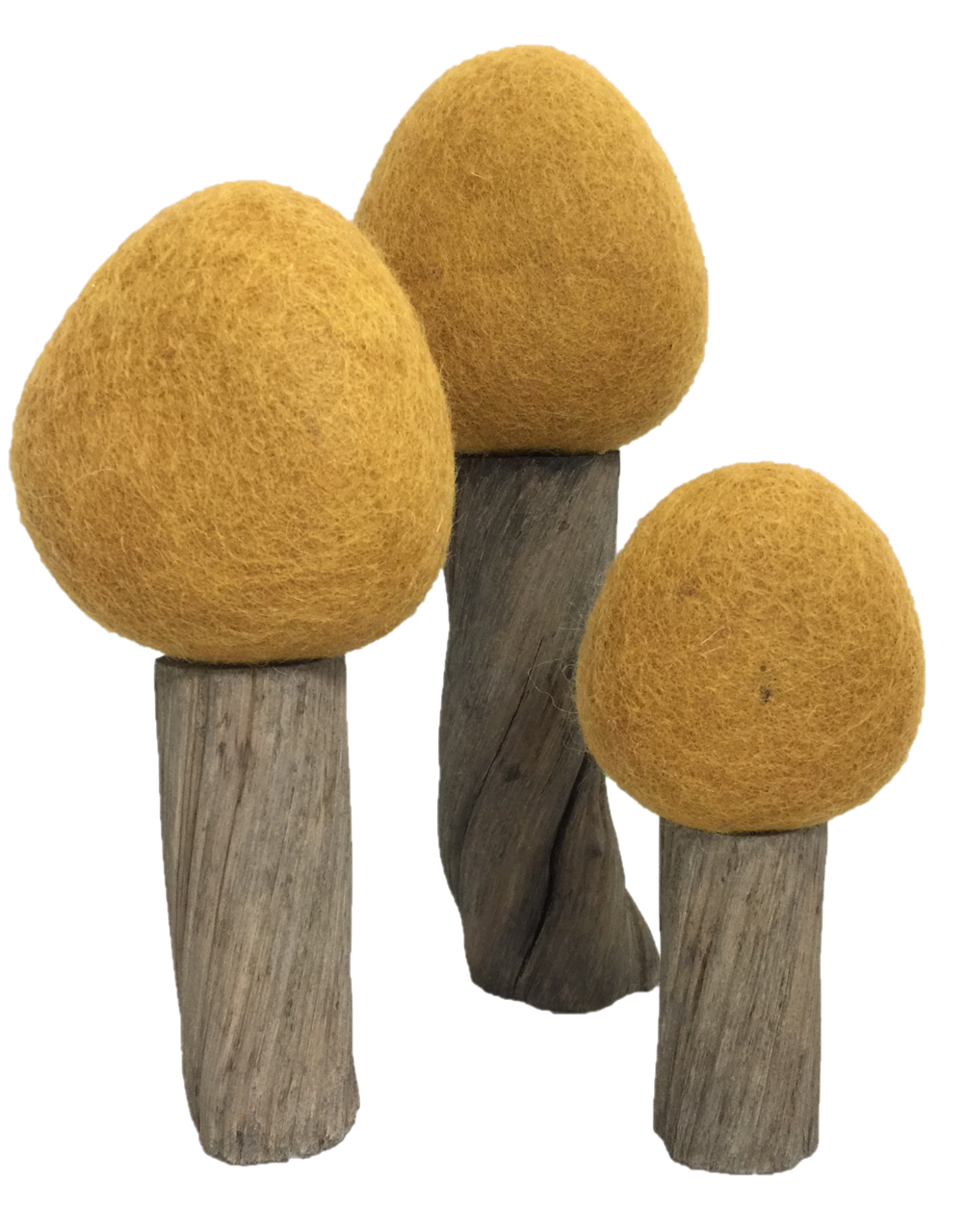 - Felted wool tops with natural wood trunks