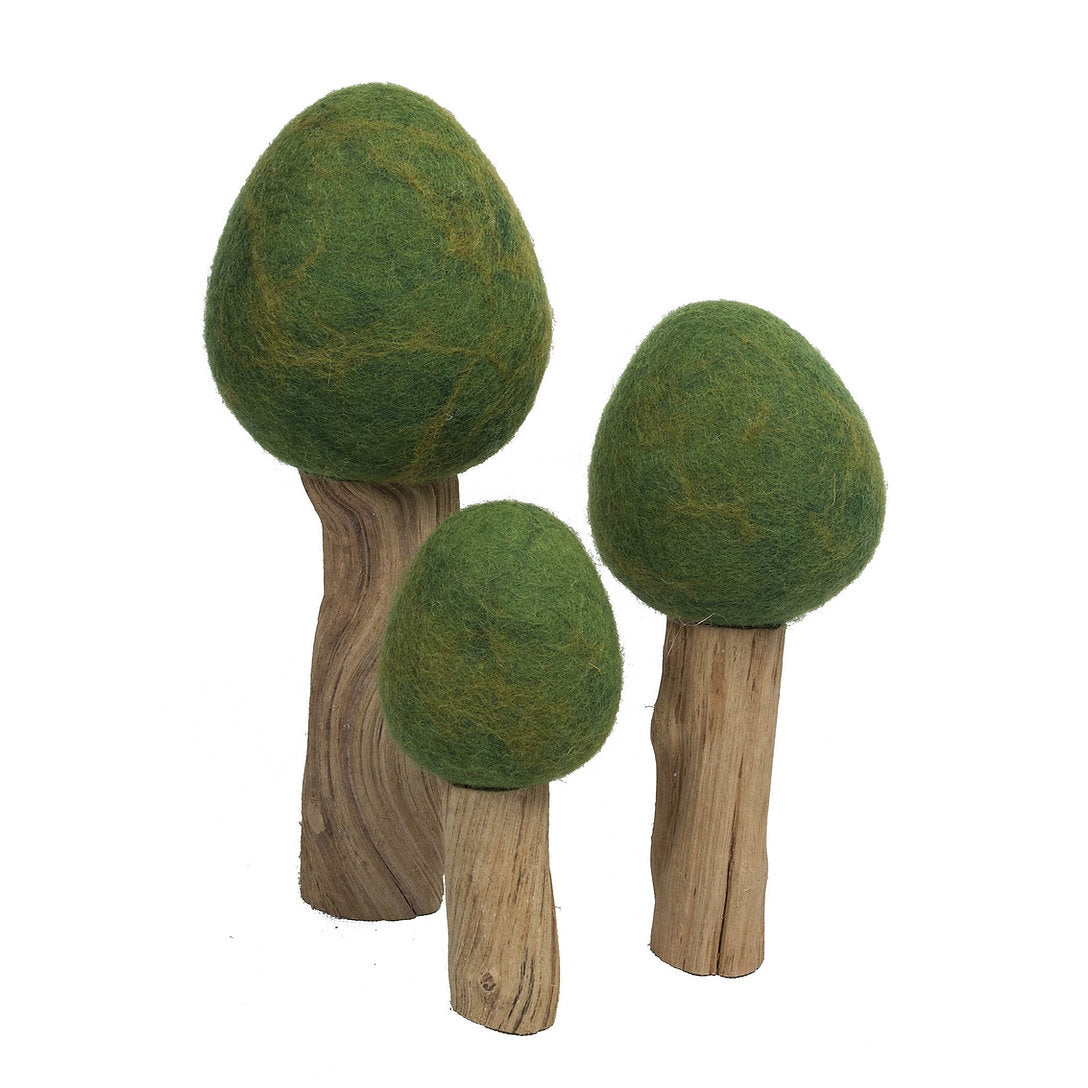 • Felted wool tops with natural wood trunks