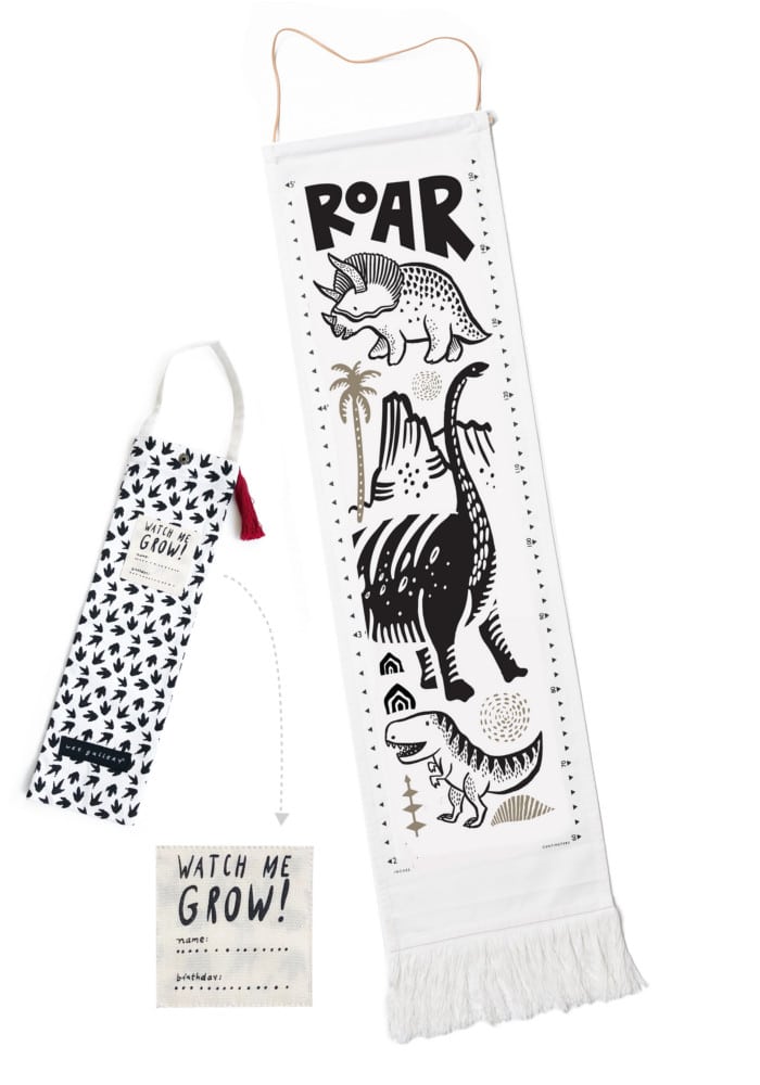 This organic cotton fabric Growth Chart features amazing dinosaurs that smile as your little one grows. The natural materials and lovely illustrations make it perfect wall tapestry accent to a stylish nursery, bedroom, or play room decor. Easily mount on a hook or nail, the twine makes it easy to move when needed.